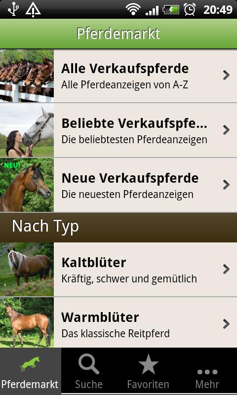 Escolha em uma das categorias existentes no mercado de cavalos ou descreva o que você está procurando com a ajuda da guia Pesquisa. O aplicativo fornecerá uma visão geral de todos os cavalos correspondentes. Classifique a lista de hits facilmente por diferentes aspectos.